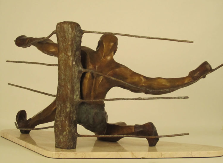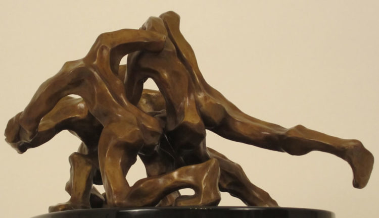 I initially wired a set of acrobatic figures in a circle that to some extent was reminiscent of- “The Dance” by Henri Matisse. Gradually, six figures were connected to shoulders, arms, hands, knees and feet. As I sculpted the figures, they became connected in so many individual positions of strain and support. Every figure has at least four connections to other figures. Even their feet are pressed together, like roots of a tree to provide more strength and stability.. Each figure is critical to the support of all the others. It is the complete, totally cooperative focus of strained effort; by a group of people aimed towards a single major goal. There is no single person who becomes the star or even the symbol of the groups achievement. All of them are better off, and safer, from their mutual enhancing strength.